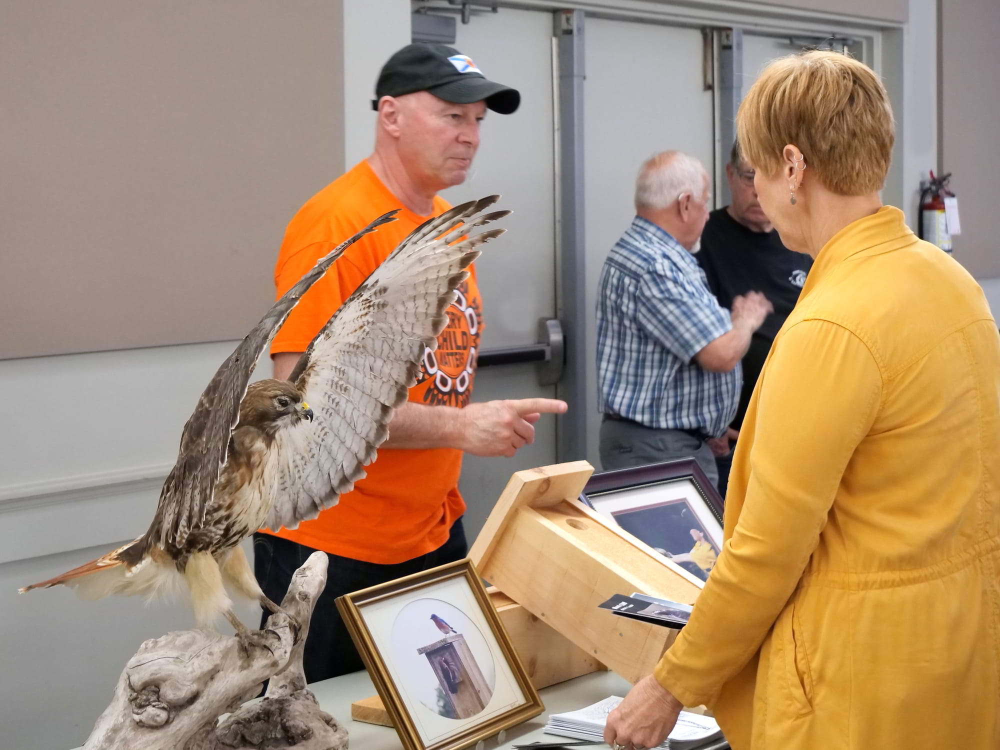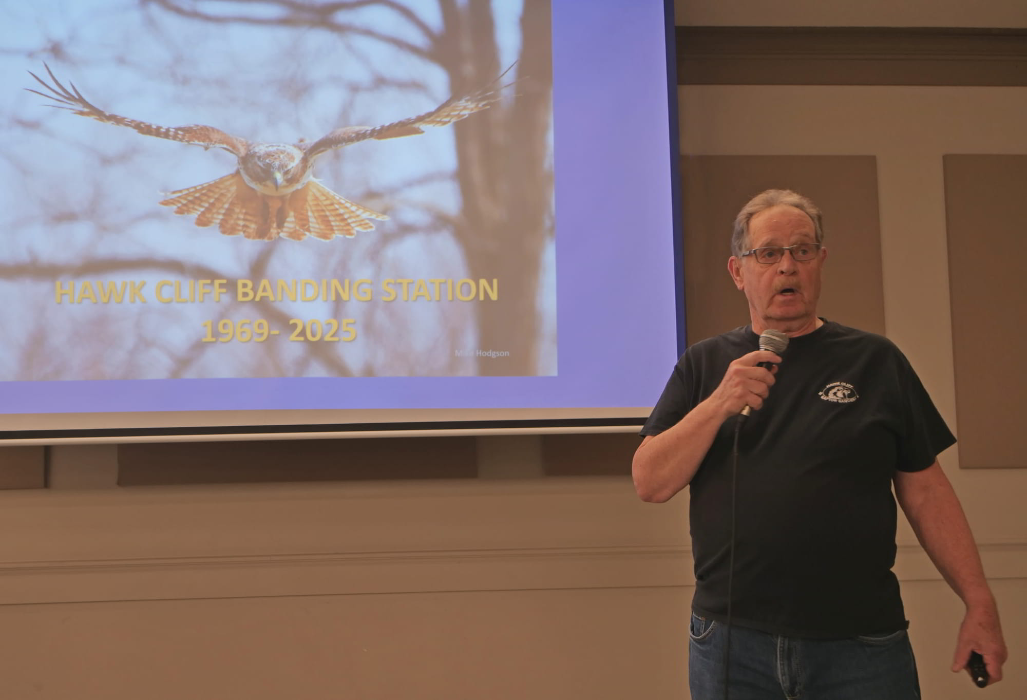 Karen Auckland introduced Al Hurst and Cyril Crocker, members of the Hawk Cliff Raptor Banders. Al talked about some of his personal